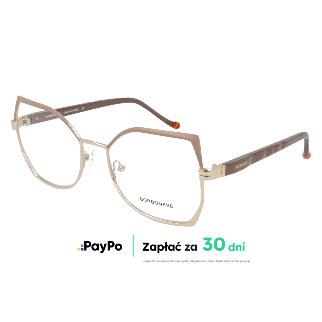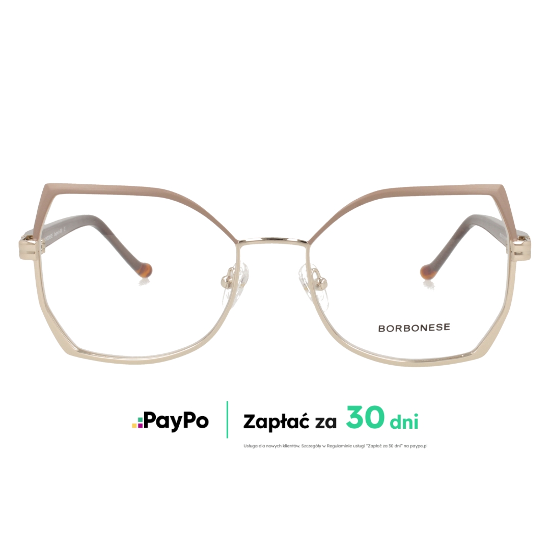 Wykonane z trwałego metalu w kolorze złota z matową, górną częścią w odcieniu ciepłego beżu. Ten model wyróżniają brązowe, kontrastujące zauszniki. Motyw 8-ki na zausznikach, charakterystyczny dla marki Borbonese, dodaje całości subtelnego, luksusowego akcentu. Te okulary doskonale pasują do wielu stylizacji, od codziennych po bardziej formalne, podkreślając indywidualny styl.