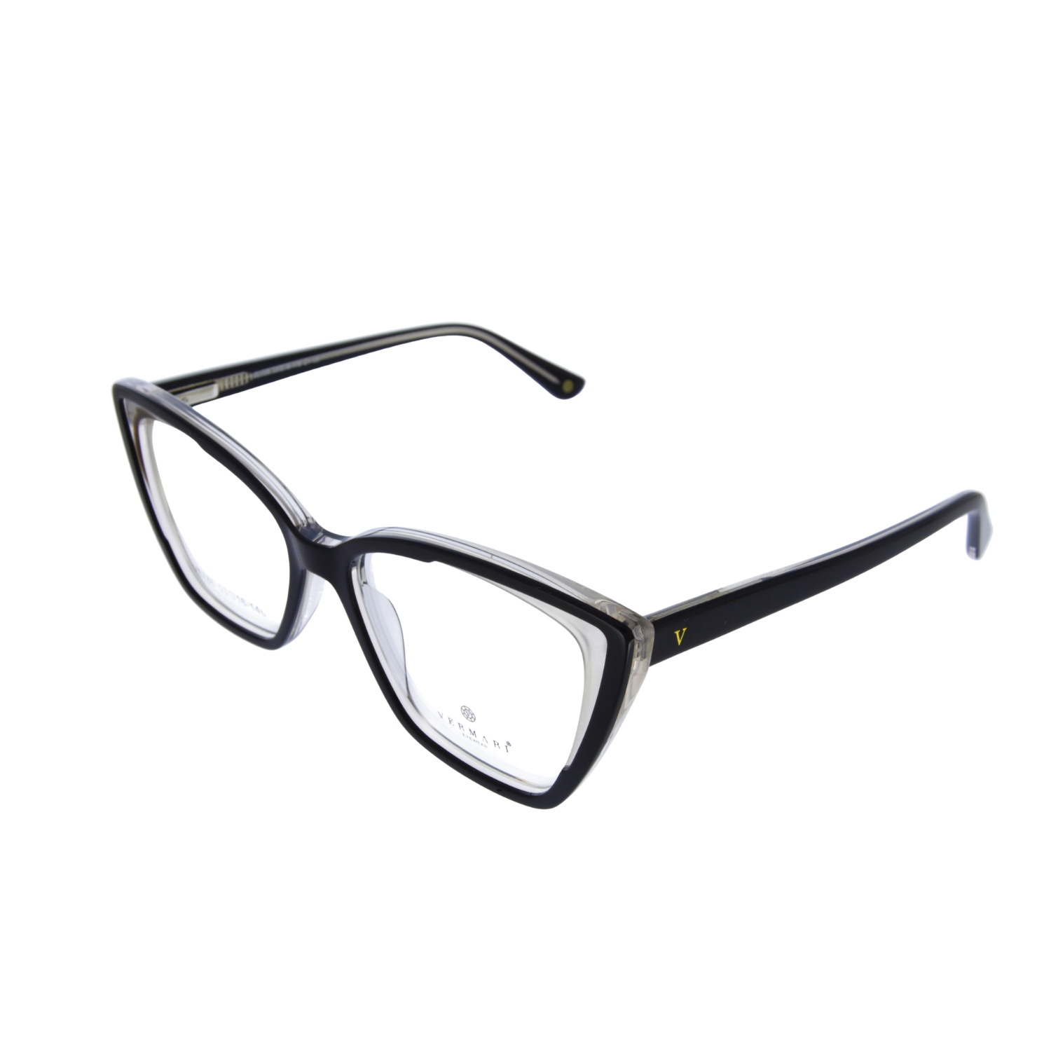 Najbardziej charakterystyczną cechą, która odróżnia model VERMARI VE786 C1 od standardowych oprawek, jest zastosowanie technologii „double frame” (podwójnej ramki). Zewnętrzna krawędź frontu zachowuje głęboką, elegancką czerń, nadając okularom pożądanej definicji. Jednak wewnętrzna część tarczy oraz mostek zostały wykonane z krystalicznie przezroczystego tworzywa.