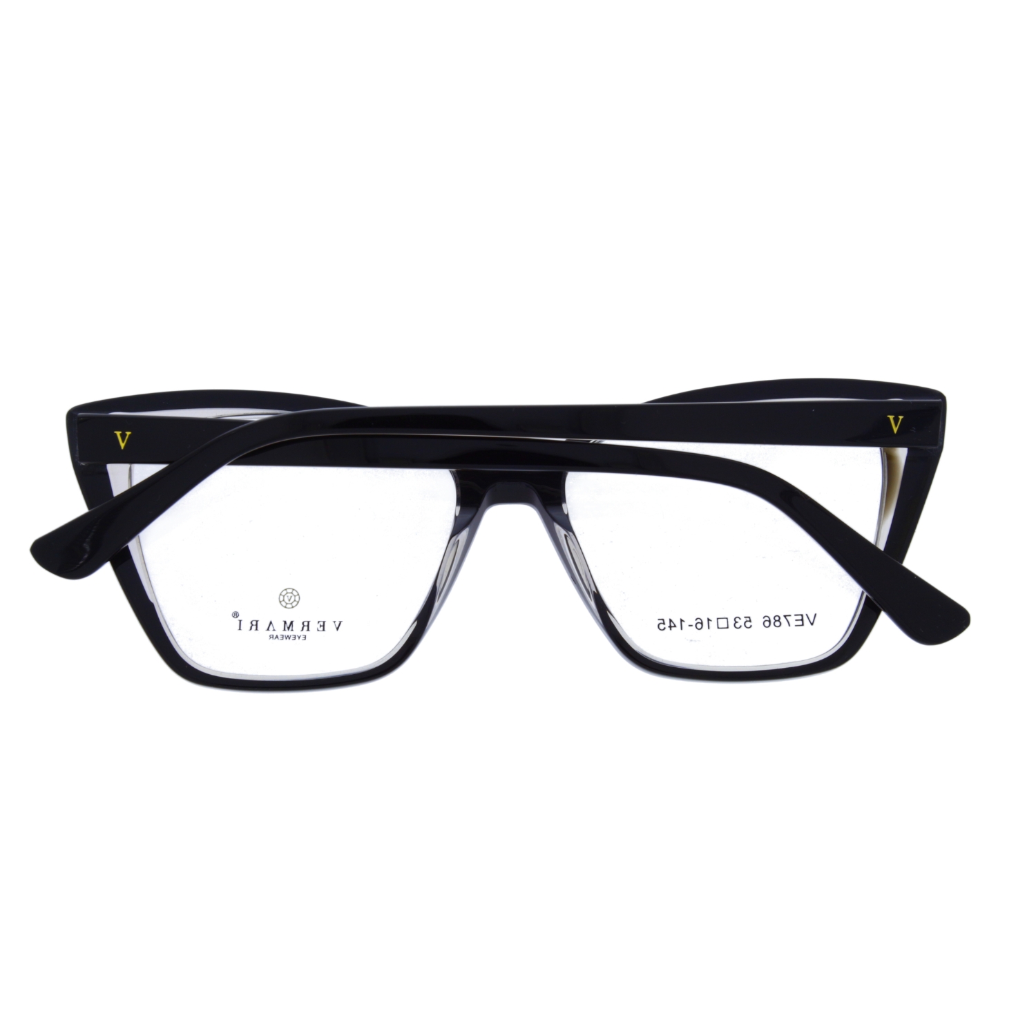 Zauszniki i Detale: Model VERMARI VE786 C1 posiada eleganckie, czarne zauszniki, na których umieszczono subtelne, złote logo marki w kształcie litery „V”. To dyskretny znak luksusu, który dopełnia całą kompozycję. Złoty akcent pięknie kontrastuje z czernią modelu VE786 C1.